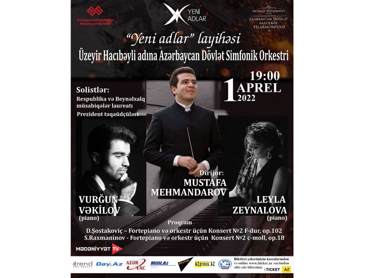 Отметим, что в рамках проекта Yeni adlar на сцене Азербайджанской государственной академической филармонии имени Муслима Магомаева молодые талантливые музыканты будут выступать с интересными концертными программами в сопровождении Государственного симфонического оркестра имени Узеира Гаджибейли, Государственного камерного оркестра имени Гара Гараева и Государственного оркестра народных инструментов.