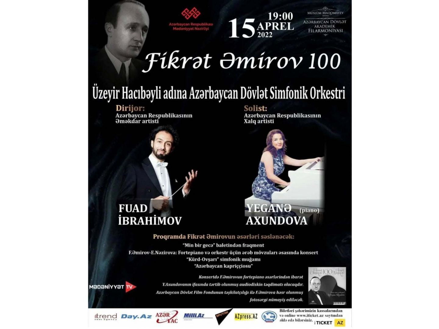На вечере прозвучат сочинения Фикрета Амирова – фрагменты из балета "Тысяча и одна ночь", симфонический мугам "Кюрд-овшары", "Азербайджанское каприччио", а также "Концерт на арабские мотивы для фортепиано с оркестром" (в соавторстве с Эльмирой Назировой).
