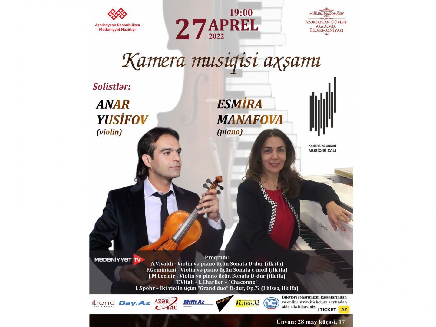 Солисты программы: скрипач Анар Юсифов и пианистка Эсмира Манафова.