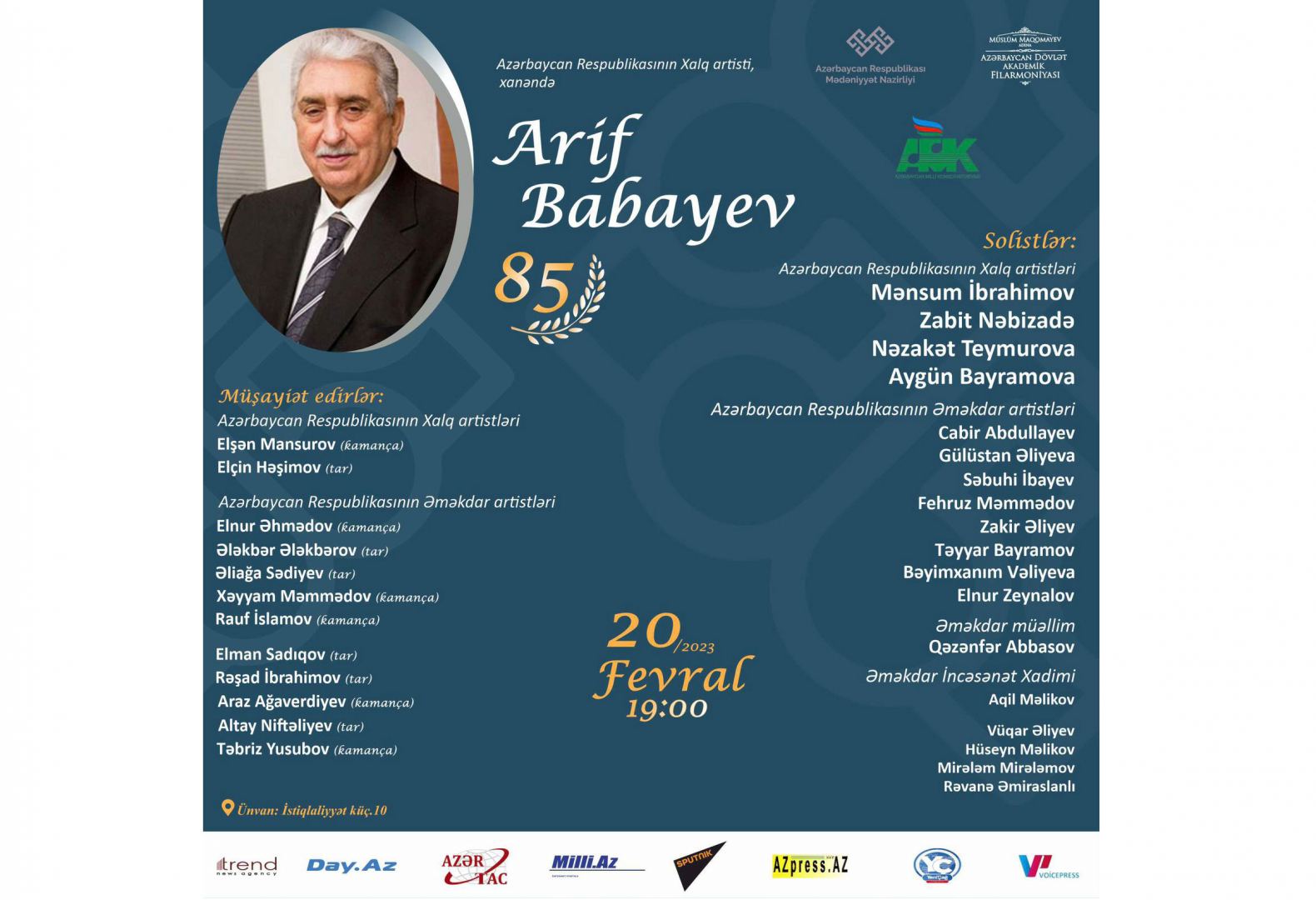 БАКУ /Trend Life/ - На сцене Азербайджанской государственной академической филармонии имени Муслима Магомаева 20 февраля состоится концерт, посвященный 85-летнему юбилею народного артиста Азербайджана, кавалера орденов "Шохрат", "Шараф", "Истиглал", ханенде Арифа Бабаева, сообщили Trend Life в пресс-службе Филармонии.