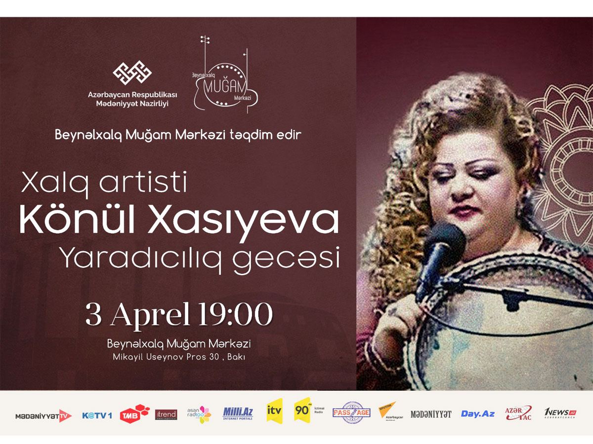 БАКУ /Trend Life/ - В Международном центре мугама 3 апреля в 19.00 состоится творческий вечер исполнительницы народных песен и мугама, народной артистки Азербайджана Кенуль Хасиевой, сообщает Trend Life. В концертной программе, приуроченной к 55-летию артиста, также примут участие коллеги исполнительницы.
