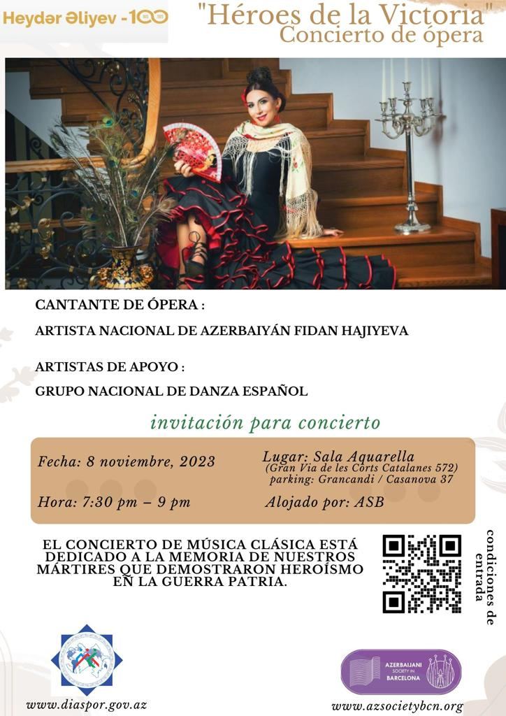 В концертной программе, которая пройдет 8 ноября, будут представлены произведения азербайджанских классиков, испанских и мировых авторов. Вечер, посвященный 100-летию великого лидера Гейдара Алиева, организован при поддержке посольства Азербайджана в Испании и Государственного комитета Азербайджана по работе с диаспорой.
