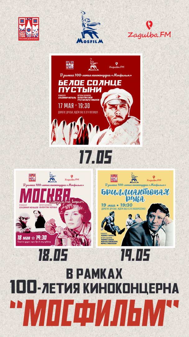 Торжественное открытие, организованное Русским Домом в Баку, состоится на площадке "Zagulba FM". На открытии 17 мая в 19:00 будет представлен легендарный фильм "Белое солнце пустыни" (режиссер - Владимир Мотыль, авторы сценария - Рустам Ибрагимбеков и Валентин Ежов), 18 мая в 19:00 будет показана картина "Москва слезам не верит" (режиссер- Владимир Меньшов, автор сценария - Валентин Черных), а 19 мая в 19:00 - "Бриллиантовая рука" (режиссер - Леонид Гайдай, авторы сценария - Морис Слободский, Яков Костюковский и Леонид Гайдай).