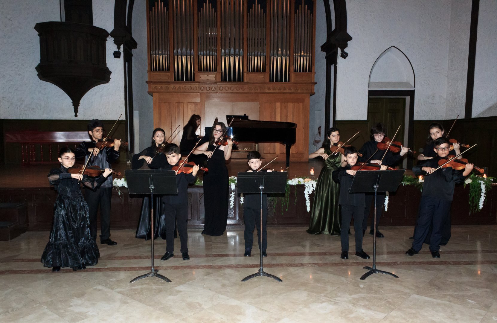 В концертной программе приняли участие ученики класса педагога Мины Аслановой. В сопровождении концертмейстера Томрис Гусейновой солисты Башир Юсифов, Али Аллахвердиев, Ибрагим Гезалов, Айла Агаева, Эмиль Нифталиев, Лейла Йолчуева, Хадида Гезалова, Ульви Мамедли, Гадир Гюнешов, Назрин Гусейнова и Айдан Гаджиахметова представили произведения европейских классиков Арканджело Корелли, Антонио Вивальди, Георга Генделя, Иоганна Баха, Джузеппе Тартини, Пьетро Локателли, Луиджи Боккерини.
