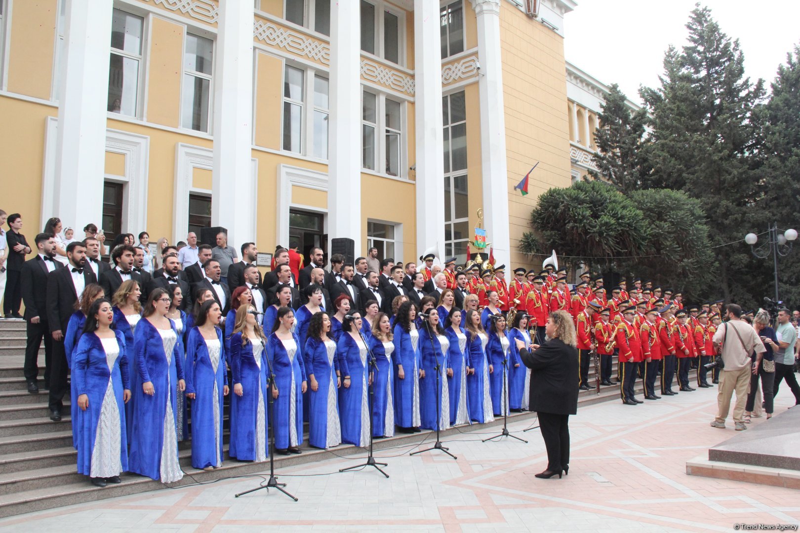 Далее состоялось выступление Отдельного образцового военного оркестра министерства обороны Азербайджана под управлением заслуженного деятеля искусств полковника-лейтенанта Руфата Ахундзаде и Государственной хоровой капеллы под управлением народной артистки Гюльбдажи Имановой.