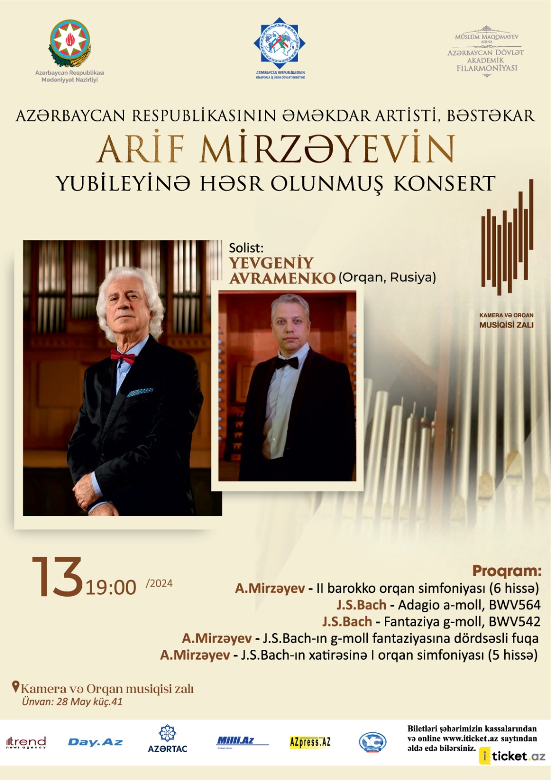 Заслуженный артист Азербайджана Ариф Мирзоев – композитор, пианист и органист. Он учился в Азербайджанской государственной консерватории (ныне Бакинская музыкальная академия) в классе Гара Гараева. Мирзоев был удостоен высоких наград на многих конкурсах, включая Международный конкурс имени И.С. Баха.