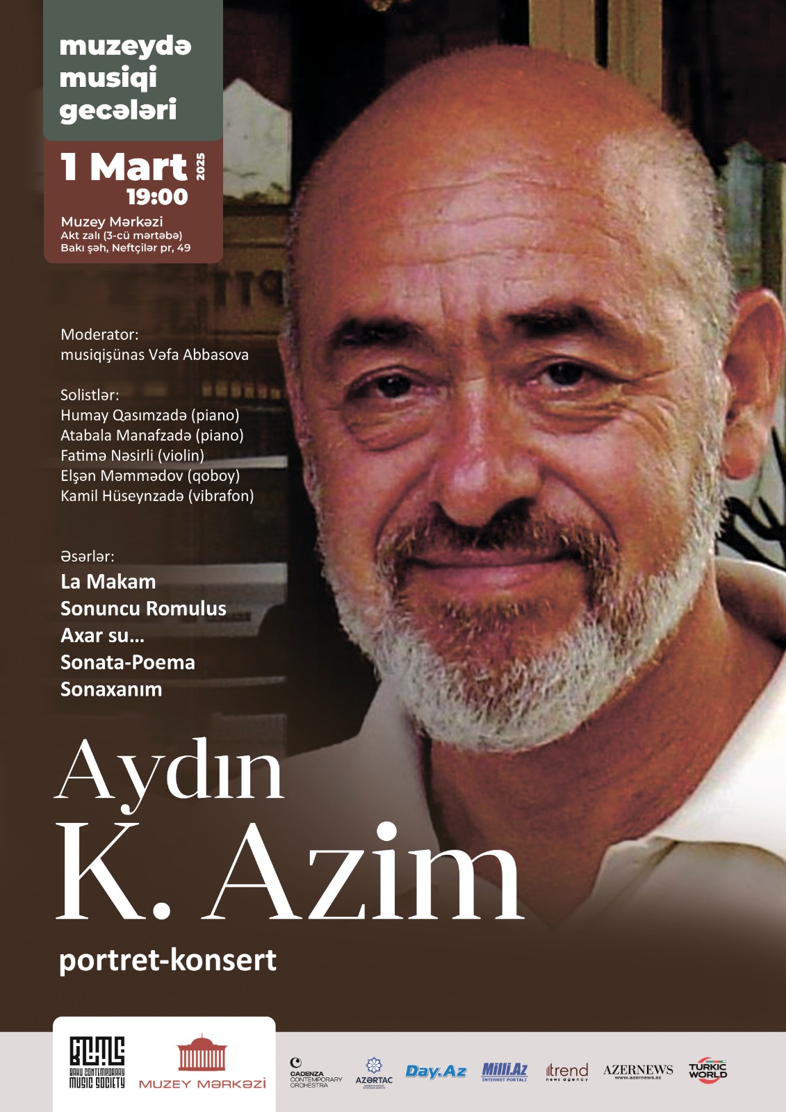 БАКУ /Trend Life/ - В рамках совместного проекта "Музыкальные вечера в музее" Бакинского общества современной музыки и Музейного центра 1 марта в 19:00 состоится концерт-портрет, посвящённый творчеству композитора, профессора Айдына К. Азим, сообщили Trend Life организаторы.