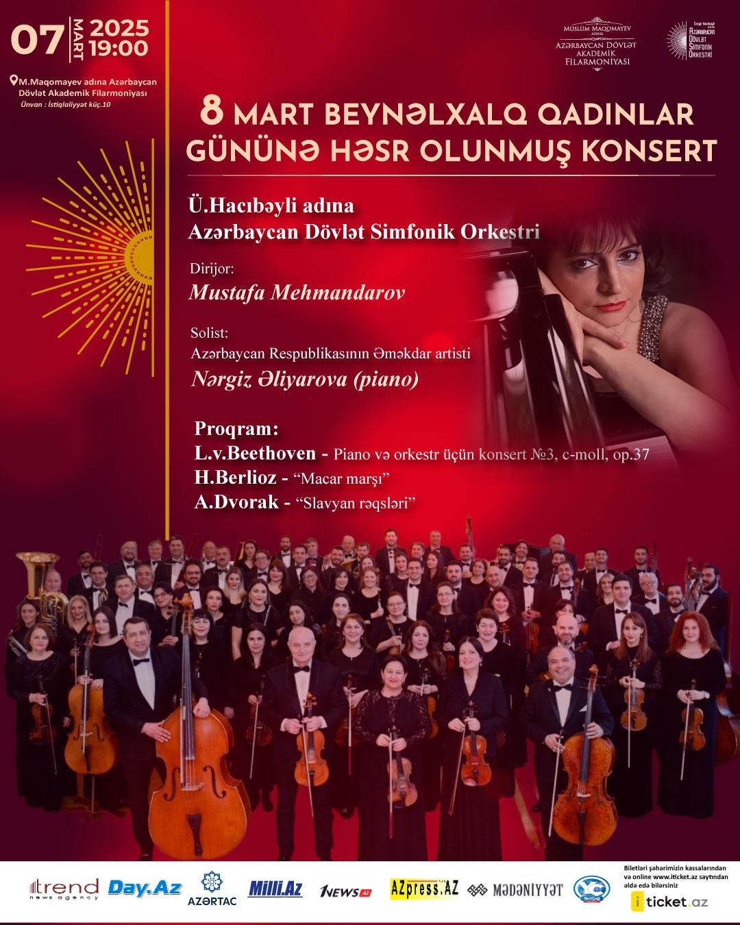 7 марта в 19:00 на сцене Азербайджанской государственной академической филармонии имени Муслима Магомаева, под руководством дирижера Мустафы Мехмандарова и с участием Азербайджанского государственного симфонического оркестра имени Узеира Гаджибейли состоится интересный концерт, посвященный Международному женскому дню 8 Марта, и в котором также примет участие солистка, заслуженная артистка Азербайджана Наргиз Aлиярова (фортепиано). В программе прозвучат произведения: Людвига ван Бетховена Концерт для фортепиано и оркестра №3 (c-moll, оп.37), Гектора Берлиоза «Венгерский марш» и Антонина Дворжака «Славянские танцы».