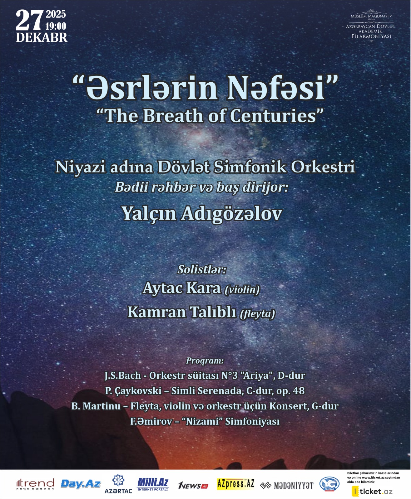 БАКУ /Trend Life/ - 27 декабря в 19:00 на сцене Азербайджанской государственной академической филармонии имени Муслима Магомаева состоится масштабный концерт под названием "Дыхание веков" (The Breath of Centuries), объединяющий музыкальные эпохи прошлого и настоящего, сообщили Trend Life в пресс-службе филармонии.