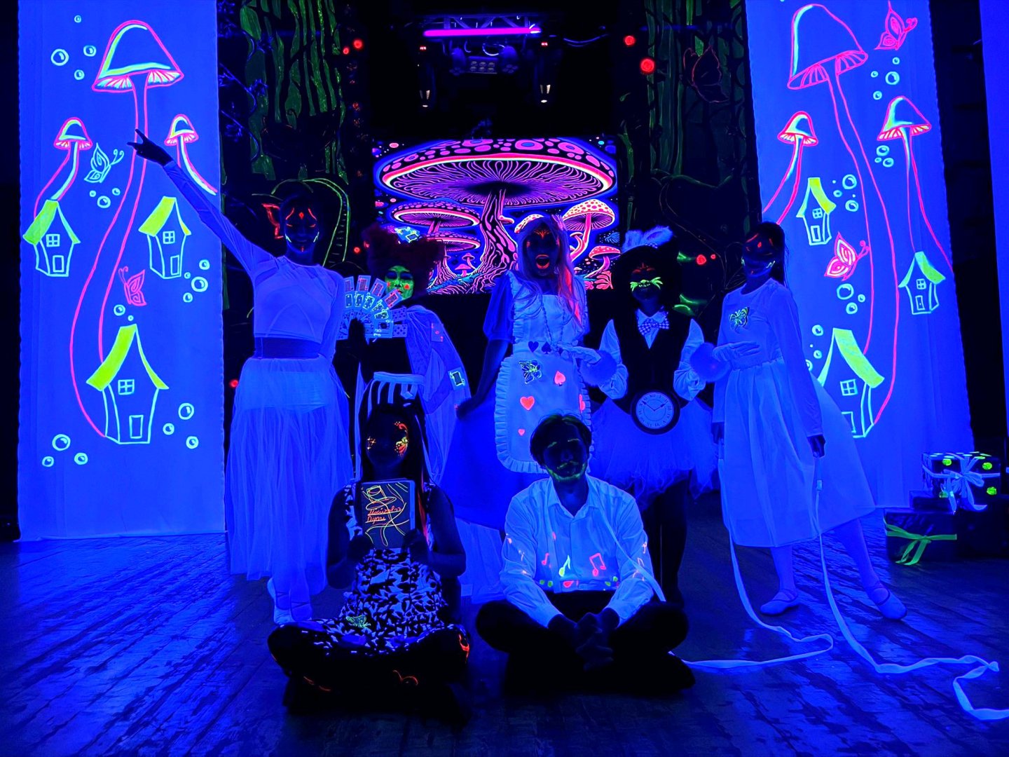 Одним из ключевых выразительных средств стали неоновые световые эффекты и визуальные инсталляции, формирующие фантазийную атмосферу Страны чудес. Интерактивные элементы спектакля стирают границу между сценой и залом, вовлекая зрителей в происходящее не только визуально, но и эмоционально. Живые вокальные номера, насыщенная хореография и красочное сценическое оформление придают постановке особый ритм и энергию.