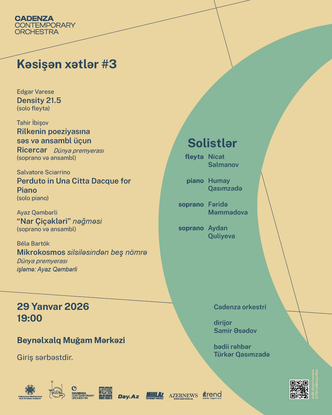 Особо отмечается, что два произведения программы -"Riercar" Тахира Ибишова и пять пьес из цикла "Микрокосмос" Белы Бартока - прозвучат в рамках мировой премьеры. Пьесы Бартока будут исполнены оркестром Cadenza в обработке композитора Аяза Гамбарли.
