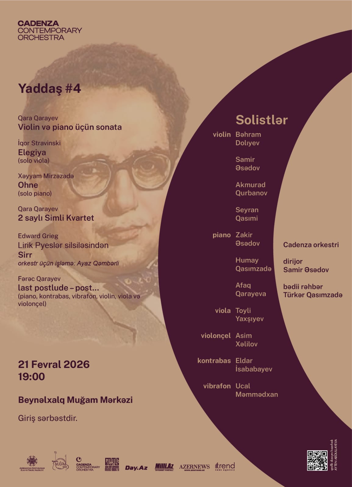 Концерт пройдет в Международном центре мугама. В программе вечера прозвучат: Соната для скрипки и фортепиано и Струнный квартет № 2 великого азербайджанского композитора Гара Гараева, "Элегия" Игоря Стравинского, произведение "Ohne" (Без) Хайяма Мирзазаде, пьеса "Тайна" из цикла «Лирические пьесы» Эдварда Грига, а также сочинение "last postlude-post..." Фараджа Караева.