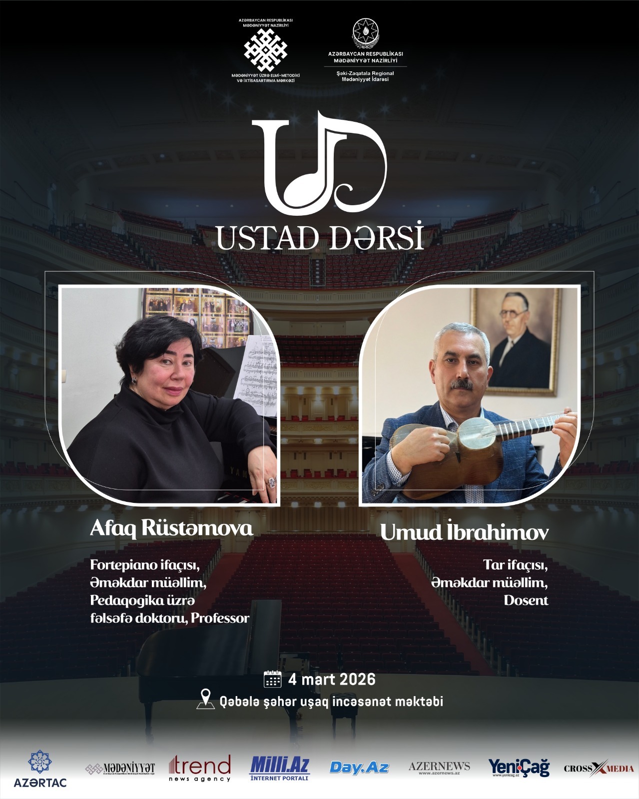 Мастер-класс по фортепиано проведет заслуженный педагог, доктор педагогических наук, заведующая кафедрой фортепиано, органа и клавесина Бакинской музыкальной академии имени Узеира Гаджибейли, профессор Афаг Рустамова, а мастер-класс по тару - заслуженный педагог, доцент, заведующий кафедрой народных инструментов Азербайджанского государственного университета культуры и искусств Умуд Ибрагимов.