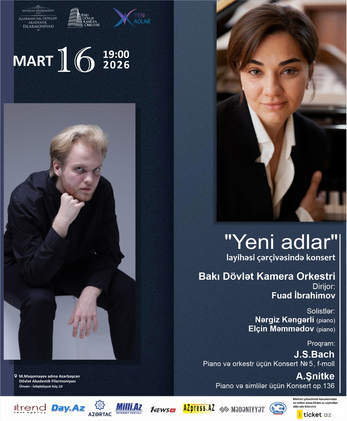 Солистами вечера станут молодые пианисты Эльчин Мамедов и Наргиз Кенгерли. В программе прозвучат Концерт №5 для фортепиано с оркестром (фа минор) Иоганна Себастьяна Баха и Концерт для фортепиано с оркестром (op.136) Альфреда Шнитке.