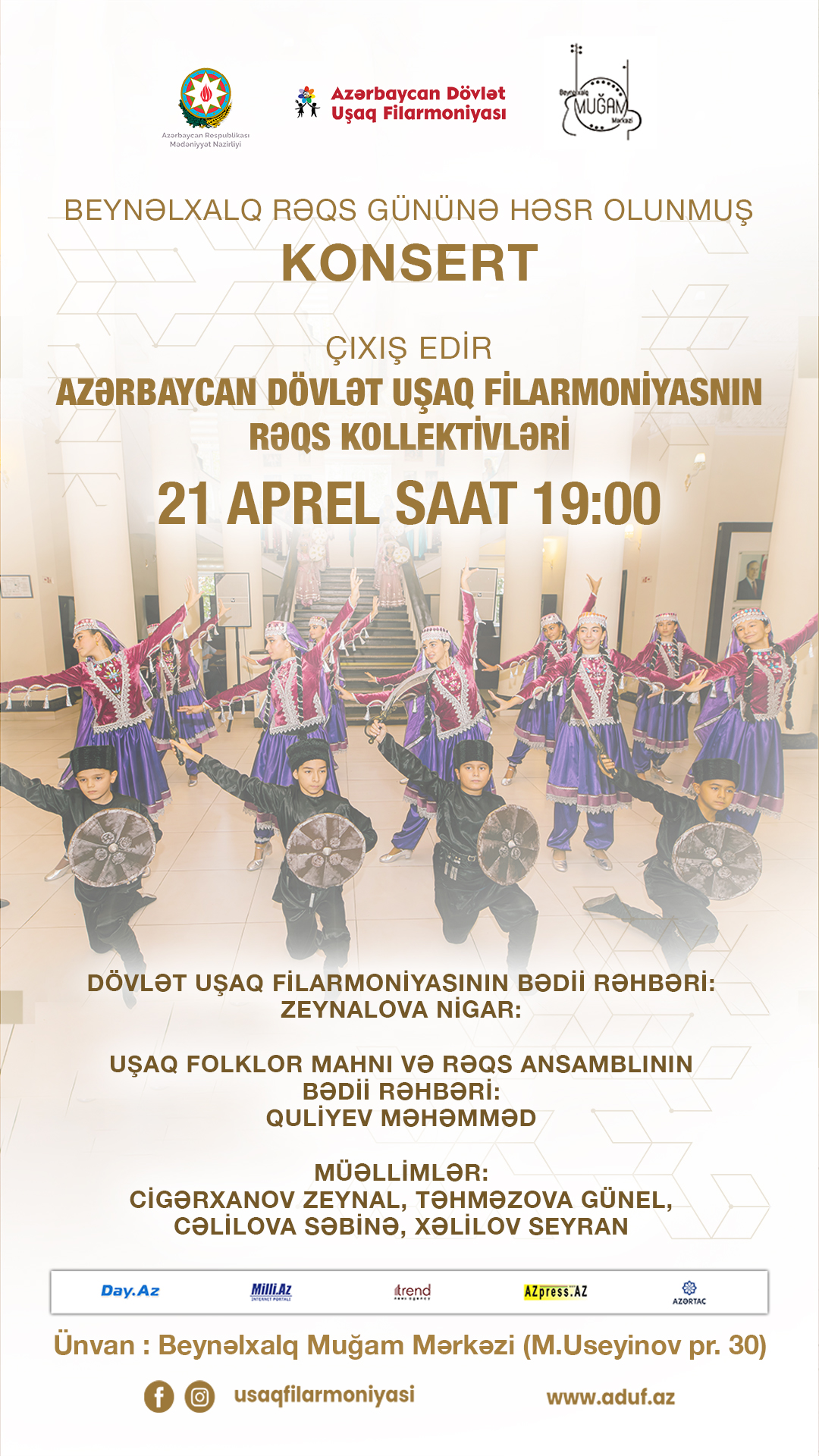 В рамках вечера выступят танцевальные коллективы, действующие в составе Детского фольклорного ансамбля песни и танца Азербайджанской государственной детской филармонии. Зрителям будут представлены разнообразные хореографические композиции, отражающие богатство и самобытность национальной культуры.