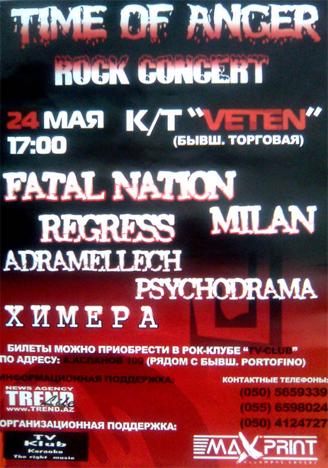 Об участниках фестиваля. Отцы отечественного треш-метла Fatal Nation выйдут на сцену после небольшого перерыва с новыми песнями, которые наверняка тронут сердца их поклонников. Надеемся, что группа Regress покажет себя на этот раз с лучшей стороны, несмотря на свое название. Молодые рок-бэнды Adramellech и Psyhodrama смогут утвердиться, "откатав" свой материал на публике. Любителей русского Hard & Heavy ждет выступление группы "Химера". Ну, и заключительной, но очень романтической частью концерта станет выступление Милана, который презентует на концерте свою новую песню. Так что желающие увидеть все это своими глазами должны поторопиться, ведь количество мест ограничено. Концерт пройдет в кинотеатре "Ветен", а билеты можно приобрести в рок-клубе TV-Club по адресу А.Асланова, 109 (рядом с бывшим Portofino).