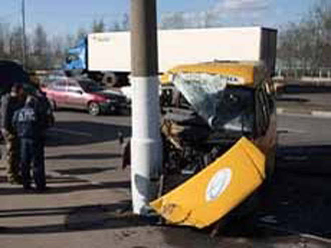 Вчера вечером в Москве на ул. Подольских курсантов, 22-а, произошла авария с участием маршрутной Газели и автомашины такси "Рено", в результате которой микроавтобус врезался в бетонный столб.