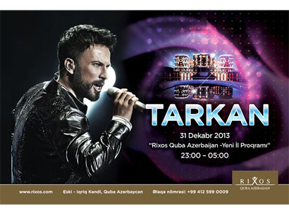 Стала известна дата самого ожидаемого открытия года. Так, открытие отеля RIXOS QUBA AZERBAIJAN, который входит в сеть всемирно известных 5 звездочных отелей RİXOS , будет отмечаться блестящей концертной программой 31 декабря. В связи с этим случаем , икона поп музыки, мега-стар Tarkan приглашает всех своих поклонников в RIXOS QUBA AZERBAIJAN. Таркан будет праздновать Новый Год в Губе , исполняя самые популярные песни из своего репертуара , на грандиозной сцене отеля в ночь с 31 декабря на 1 -е января. Этой ночью Вас ждут - торжественный обратный отсчет до начала Нового года , сопровождающийся эксклюзивным фейрверк- шоу у бассейна, нон-стоп DJ перфоманс и много других сюрпризов. Спешите встретить Новый 2014 Год в незабываемой атмосфере с Тарканом , в отеле RIXOS QUBA AZERBAIJAN.