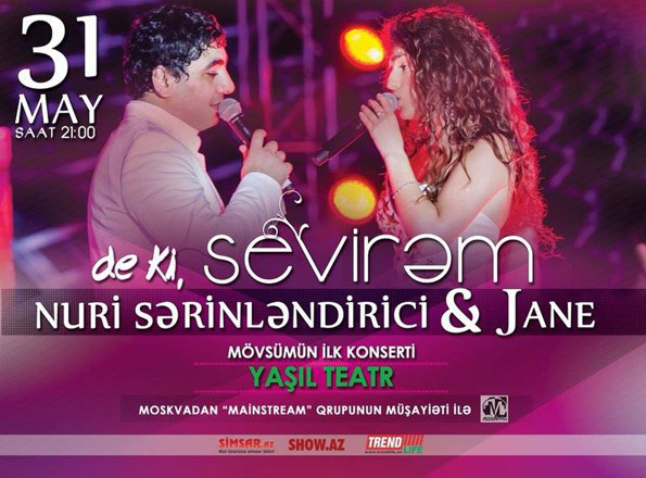 В Зеленом театре Баку 31 мая состоится концерт популярных исполнителей из Москвы Nuri Sərinləndirici & Jane под названием "De ki, sevirəm" ("Скажи, что люблю"), сообщили Trend Life в пресс-службе организаторов вечера. В концерте примет участие российская группа "MainStream". Организатор концерта - режиссер и ведущая Lider TV Ламия Алекперова.