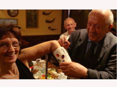 Эта идея настолько понравилась близким и коллегам Ирины Эльдаровой, что даже сам выдающийся художник Таир Салахов решил расписаться на этой "Бриллиантовой руке" Ирины Эльдаровой.