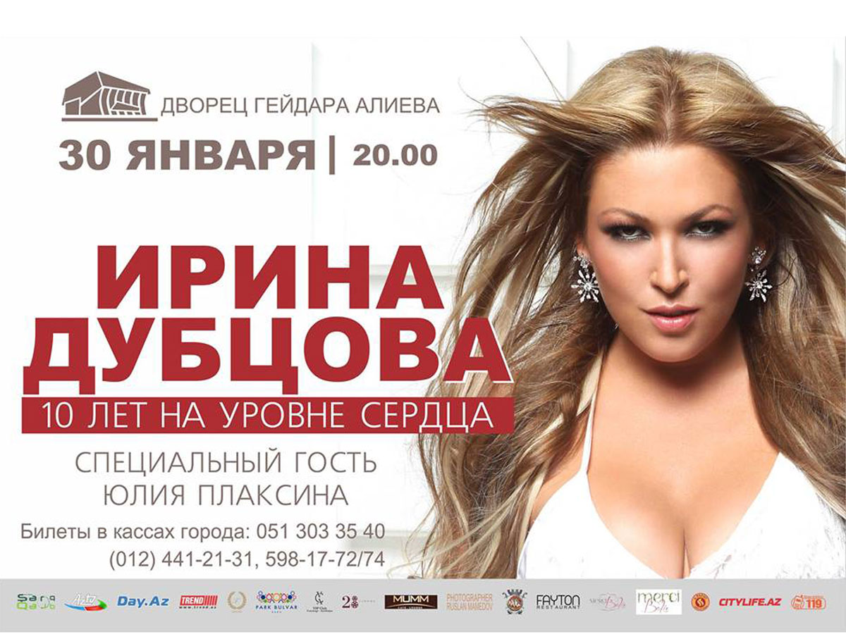 БАКУ /Trend Life/ - 30 января 2015 года на сцене Дворца Гейдара Алиева в Баку впервые пройдет шоу-концерт популярной российской певицы, поэта и композитора Ирины Дубцовой, сообщили Trend Life организаторы концерта.