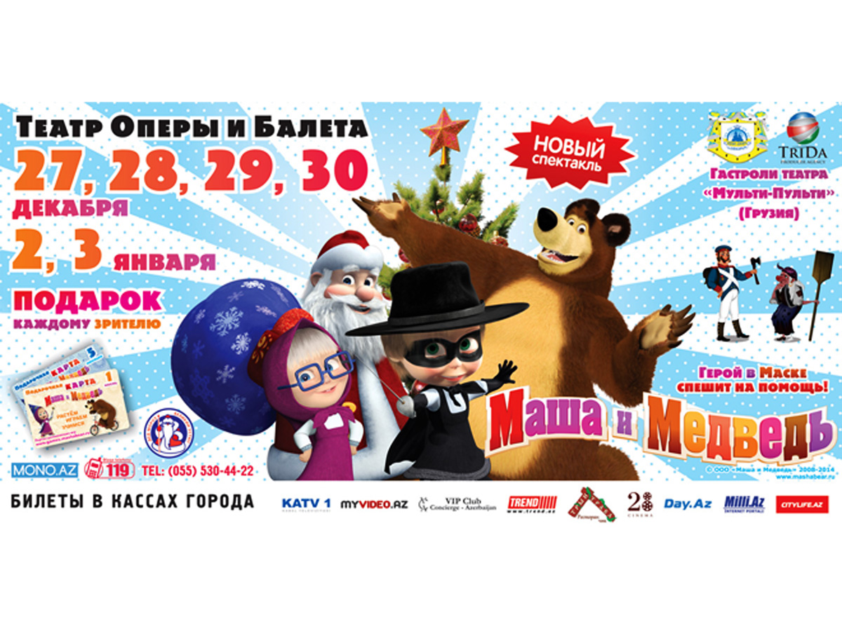 С 27 декабря по 3 января на сцене Азербайджанского государственного академического театра оперы и балета состоится новогодний спектакль "Герой в маске спешит на помощь!", по мотивам всеми любимого мультсериала "Маша и Медведь".
