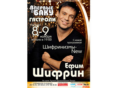 БАКУ /Trend Life/ - Ко Дню Государственного флага Азербайджана с 28 октября по четвертое ноября Азербайджанский государственный русский драматический театр имени Самеда Вургуна в Баку начинает грандиозную праздничную акцию на сольный концерт российского юмориста Ефима Шифрина - "Шифринизмы - New", который пройдёт восьмого и девятого ноября, сообщили Trend Life в пресс-службе театра.