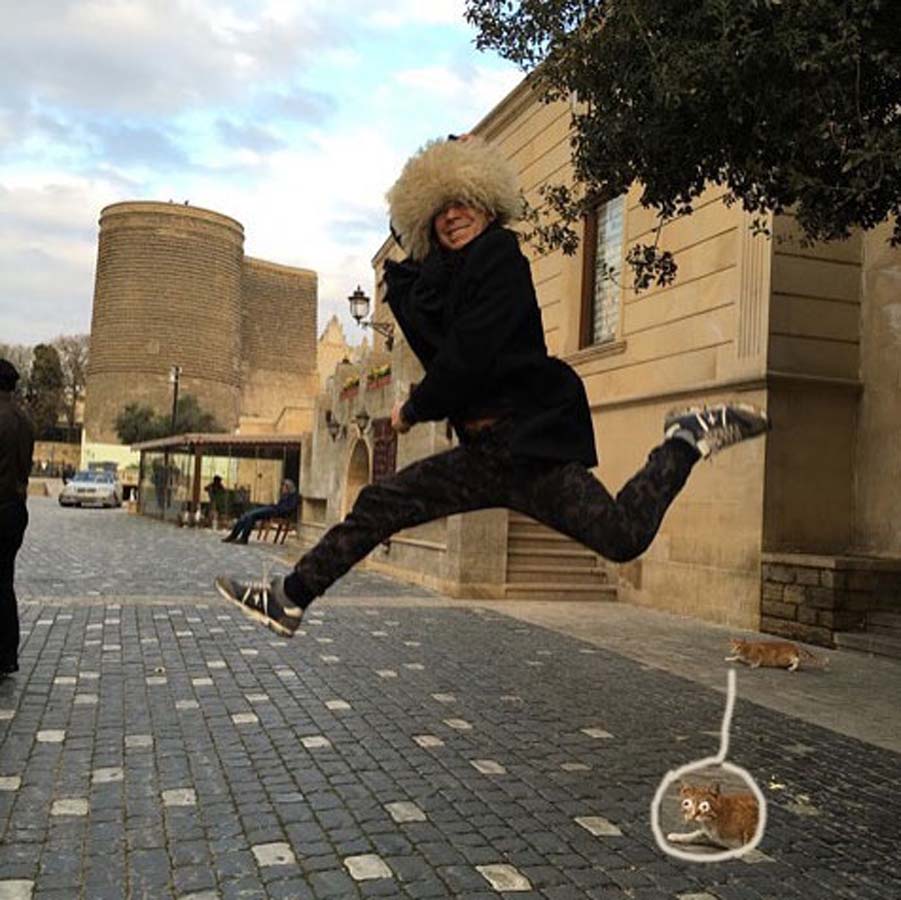 Артист разместил фотографию в Instagram и написал: "Спасибо, Баку, за горячий приём! Показал жене Старый город. Во время этого прыжка не пострадала ни одна бакинская кошка".
