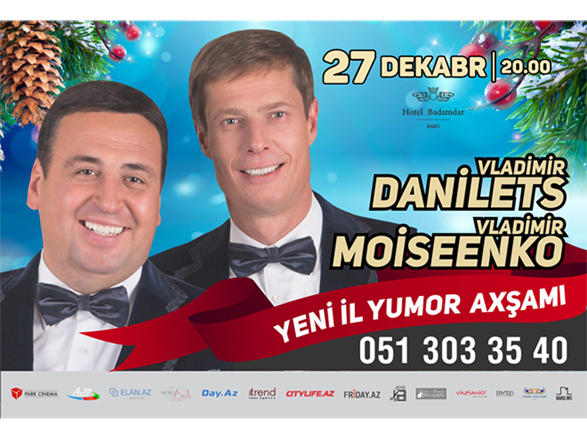 Праздничный Новогодний вечер юмора народных артистов Украины Владимира Данильца и Владимира Моисеенко состоится 27 декабря в 20-00 на сцене "Аудиториум Холл" Hotel Badamdar Baku.