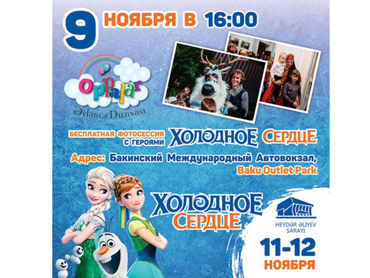 "Внимание! У всех, кто купил билеты на спектакль "Холодное сердце", есть возможность встретиться и бесплатно сфотографироваться с героями мультфильма. Встреча состоится 9 ноября в 16:00, в здании Бакинского международного автовокзала - Baku Outlet Park, на первом этаже. А те, кто еще не успели купить билеты, смогут сделать это прямо на встрече. Ждем вас и ваших деток!", - сообщили Trend Life организаторы спектакля MGM Production.