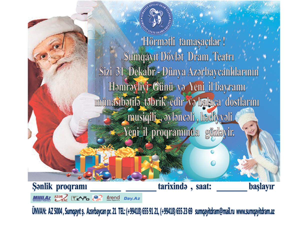 БАКУ /Trend Life/ - Коллектив Сумгайытского государственного драматического театра представит детский новогодний спектакль "Çeburaşkanın Yeni il sərgüzəştləri" ("Новогодние приключения Чебурашки"), сообщили Trend Life в пресс-службе театра. Новогоднее представление запомнится юным зрителям ярким и увлекательным сюжетом.
