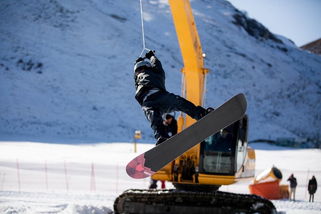 Участники смогли показать свое мастерство на лыжах или сноуборде при большой скорости, набранной за счет центрифуги гигантского экскаватора.