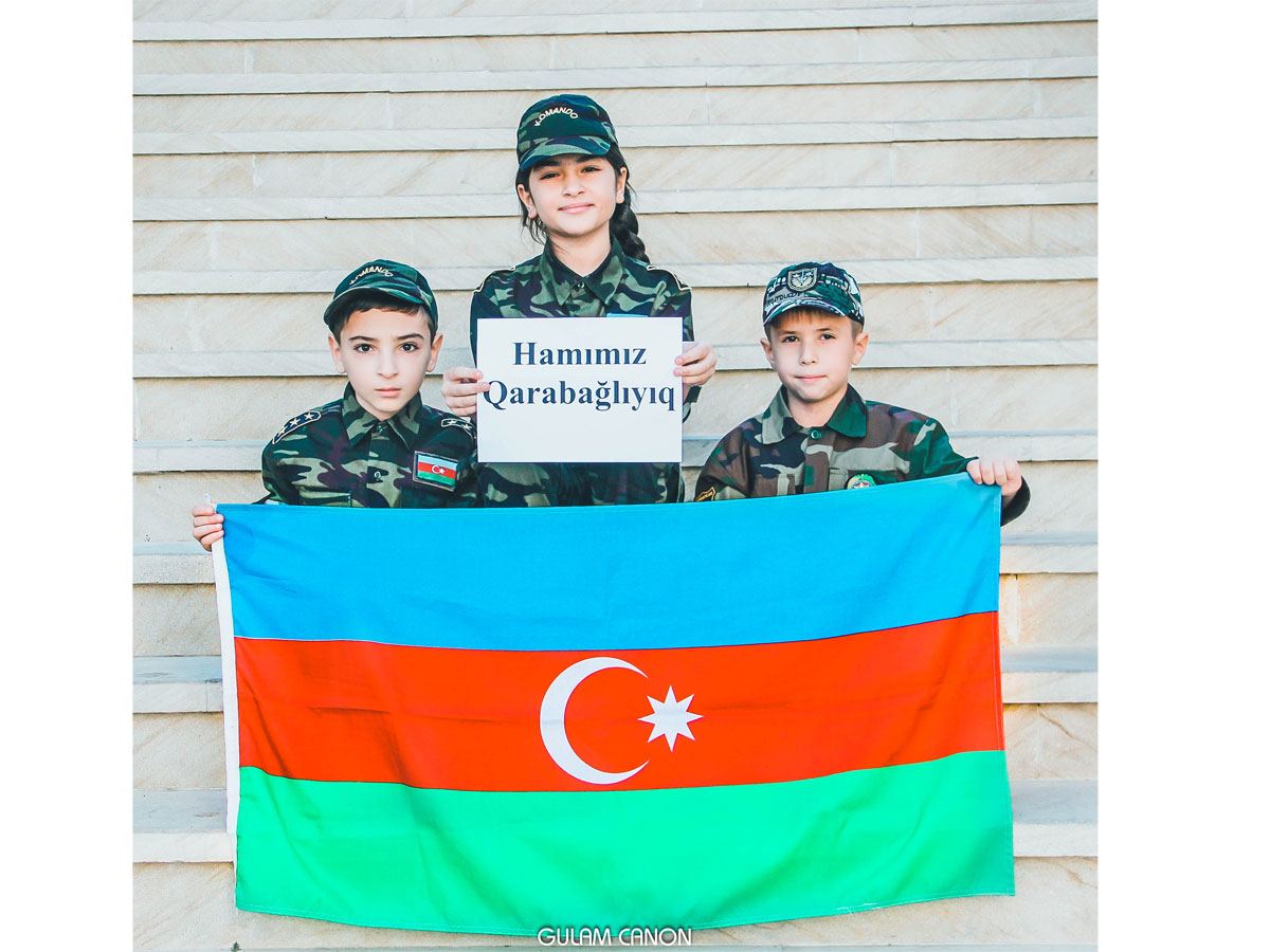 Дети в камуфляжной одежде предстали с флагом Азербайджана и лозунгами "Карабах – это Азербайджан", "Да здравствует солдат Родины!", "Все мы из Карабаха", "Мы хотим посетить город Шуша".