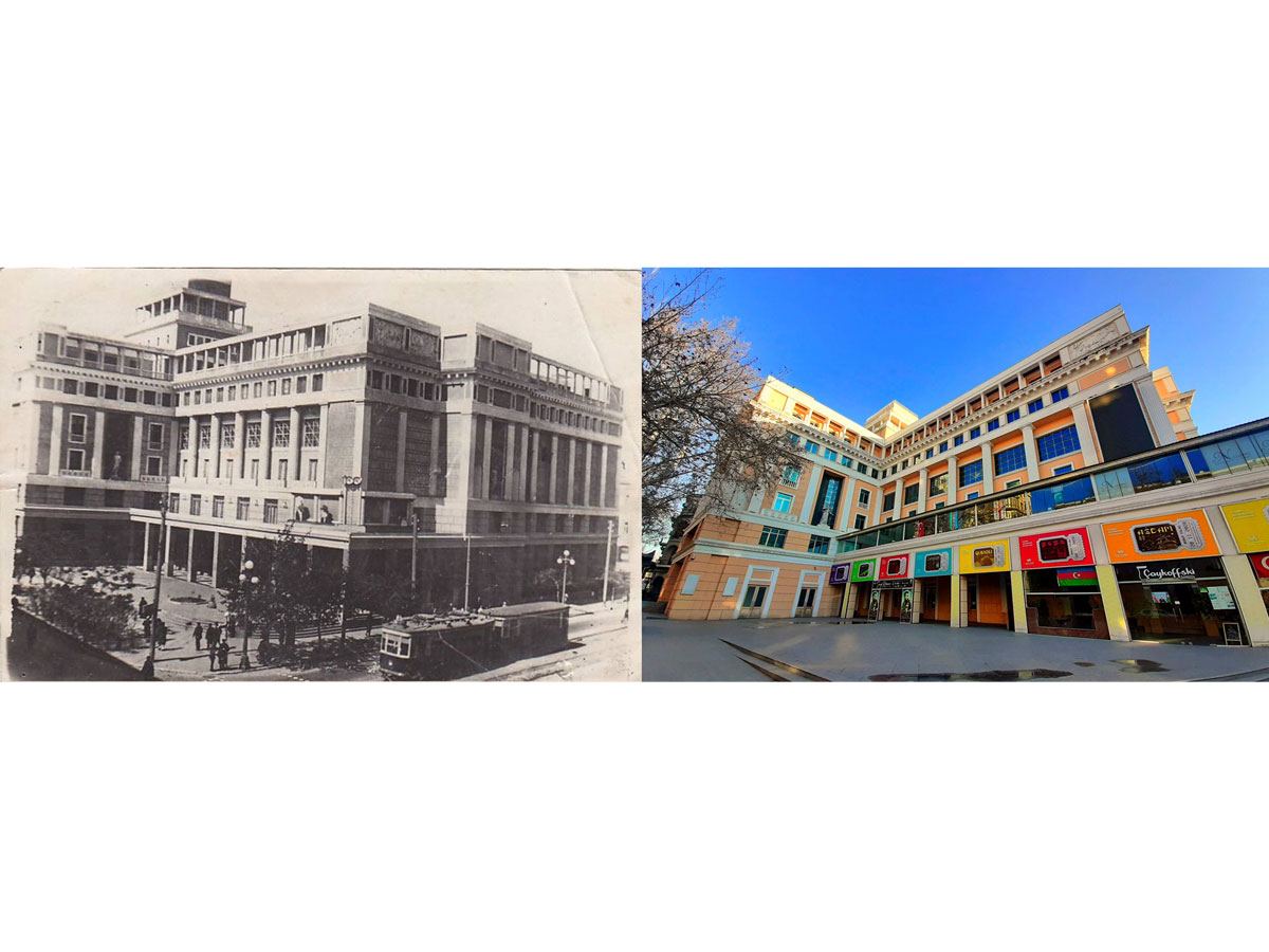 Проект двух зданий, расположенных симметрично на перекрёстке по обе стороны улицы имени 28 мая/проспект Бюльбюля, был разработан молодыми архитекторы Микаилом Усейновым и Садыхом Дадашевым. В 1934 году был составлен проект левого здания - кинотеатра "Художественный" (Киноцентр "Низами"), а в 1935 году правого - Наркомата пищевой промышленности республики.