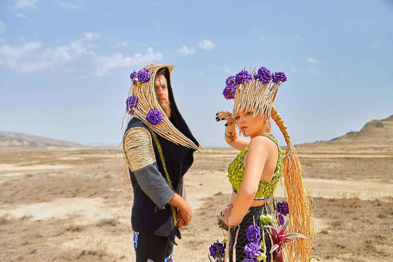 "Согласно сюжету, в результате апокалипсиса мир превратился в выжженную пустыню, по которой под палящим солнцем странствует пара. У нее особая миссия - возродить этот мир. Пара несет с собой спасенные растения и надеется найти людей, которые смогут сохранить и приумножить наследие человечества в виде растений и цветов как символов природы, возрождения и начала новой жизни. Головные уборы героев выполнены в форме половины сердца и символизируют любовь. Декор обуви отражает процесс зарождения растений. В декорировании костюма использованы элементы CD-дисков, на которых были записи из мирной жизни. Несмотря на то, что диски повреждены, они являются памятью о прошлом и предпосылкой для восстановления мира по памяти", - сказал Trend Life флорист.