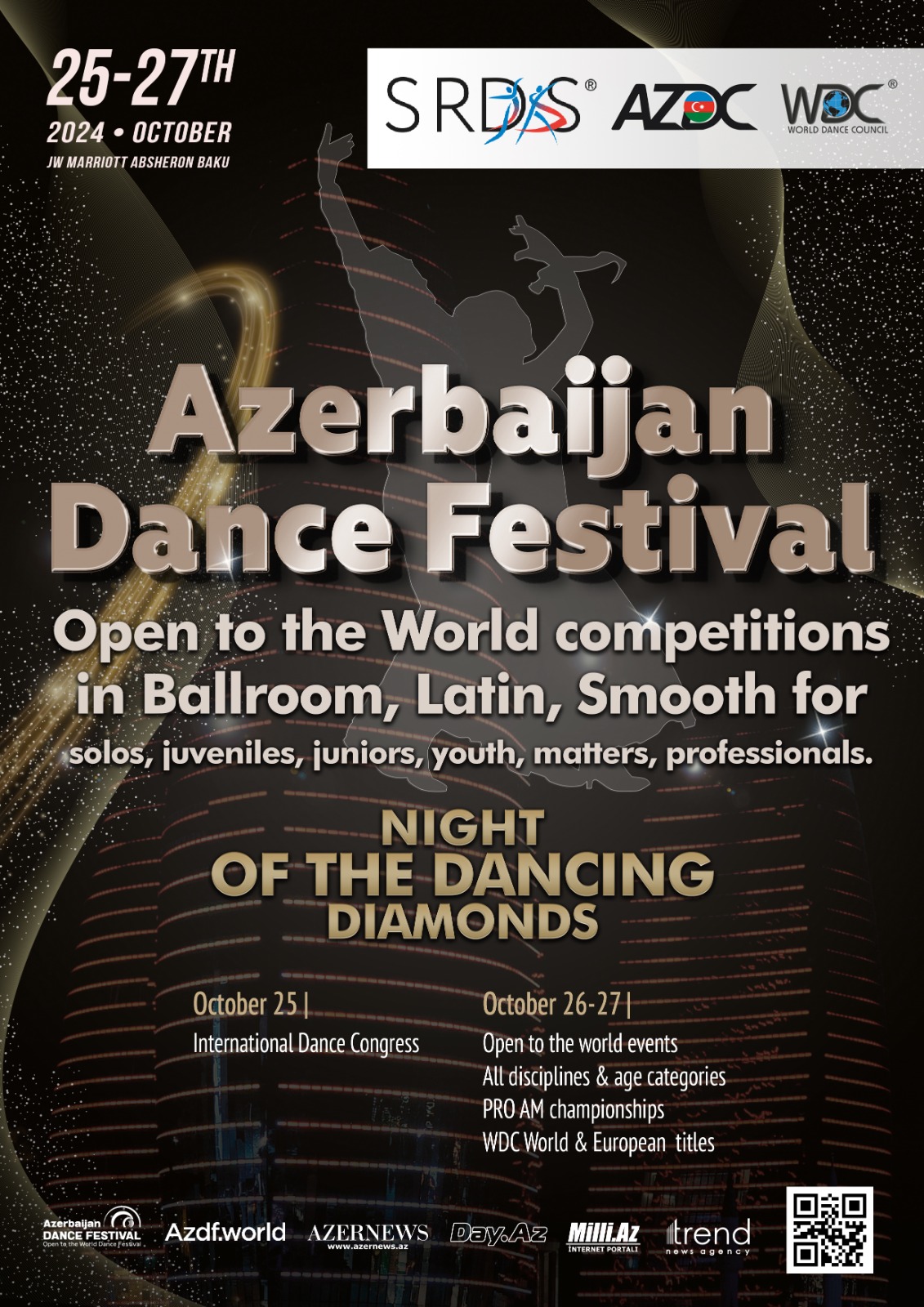 27 октября SRDS в третий раз представит азербайджанской публике уникальное гала-шоу «Ночь танцующих бриллиантов», которое будет исполнено лучшими танцевальными парами мира, настоящими бриллиантами бального танца. Ведущим гала-шоу станет заслуженный артист России, президент Российского танцевального союза Станислав Попов.