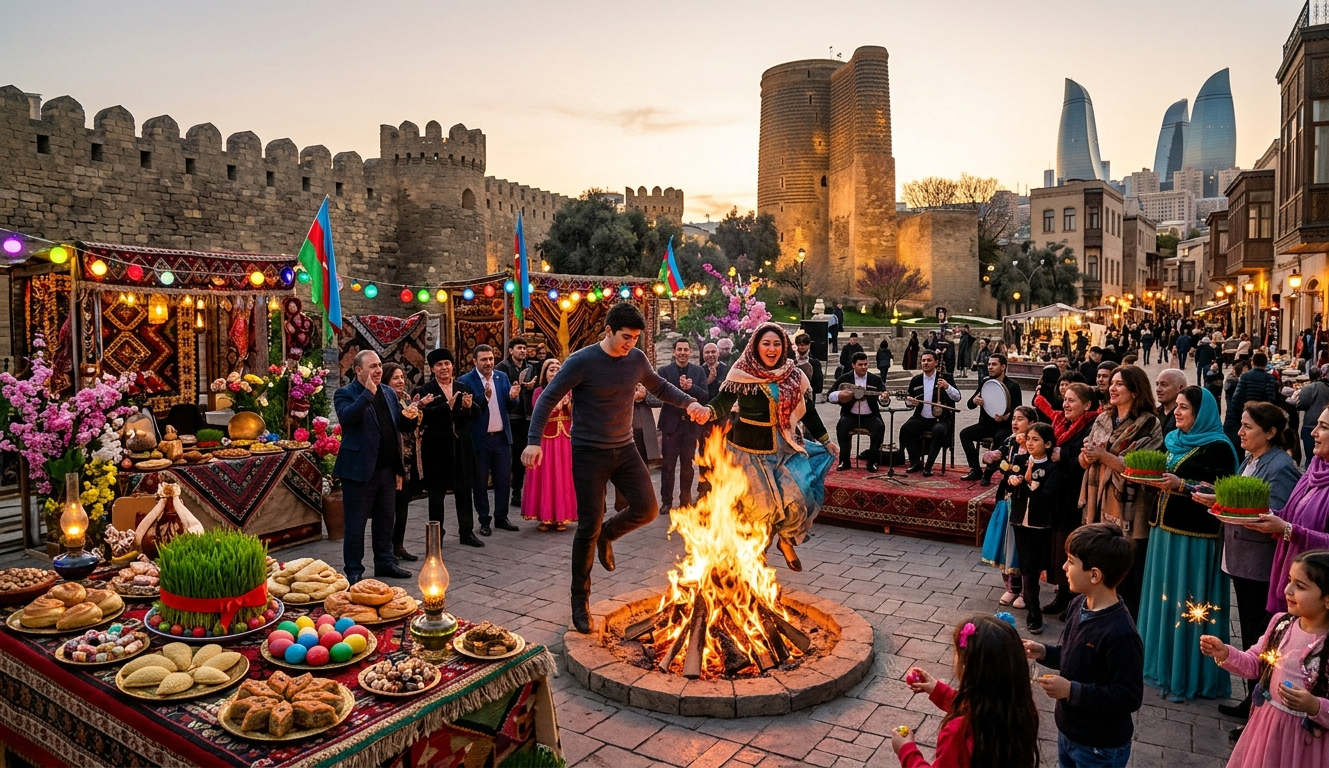 Во время празднования Новруза существует ритуал - прыжки через костер. Раньше, когда наступал вечер, каждая семья во дворе своего дома зажигала факелы, соответствующие количеству членов семьи: вступал в силу ритуал перепрыгивания через костры. Все от мала до велика, даже матери с грудными детьми, должны были перепрыгивать через горящий костер, произнося: "Все мои невзгоды тебе, а твою радость мне". Прыгать через костер следовало 7 раз. Каждый костер разжигал несовершеннолетний мальчик - этот огонь считался чистым. Считалось, что огонь очищает от скверны, облагораживает, заклинает темные силы, и все худшее старого года сгорает в пламени этот костра. Все болезни, страдания, природные бедствия, грехи как будто "пожирались" огнем, и народ заново рождался". Ни в коем случае нельзя было заливать огонь водой, а после того как он гас, девушки и юноши собирали золу и высыпали ее где-то на окраине. Звучала трель народных инструментов, люди выходили на берега рек, озер и моря и там праздновали торжества. Присутствие "четырех составляющих" вместе - земли, воды, огня и открытого воздух олицетворяло счастливое будущее. Народ веселился, танцевал, играл в "кёс-кёса", отовсюду раздавались пожелания удачи и здоровья. Устраивались петушиные и козлиные бои. Наиболее отважные переплывали водоемы. В семьях готовились национальные блюда, и все усаживались за один стол. По традиции все домочадцы должны были находиться дома, ибо в народе говорят: "Если в праздник не находиться дома - семь лет скитаний ждет тебя!". На праздничном столе считалось обязательным присутствие магической "семерки" - соли, хлеба, сахара, угля, зеркала, воды и фруктов.