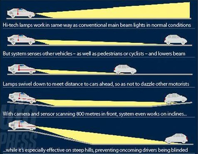 По данным Autoexpress , в случае обнаружения другого автомобиля, датчики передают сигнал на блок управления головным светом команду опустить луч фары, направив саму лампу и отражатель вниз, не уменьшая при этом уровень ее яркости. Уникальная компьютерная система распознает, в каком направлении движется тот или иной автомобиль, спускается ли он с горки или поднимается.