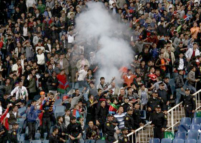 Инцидент, как передает Trend Life, вспыхнул ближе к 35-й минуте, когда неожиданно одна из дымовых шашек, брошенных из российского сектора, взорвалась в азербайджанском. Затем последовало еще несколько. В ответ азербайджанские фанаты начали отбрасывать неразорвавшиеся петарды обратно в российский сектор. После артиллерийского огня болельщики пошли врукопашную. Друг в друга летели кресла (в основном с российской стороны), все это продолжалось пока в дело не вмешались азербайджанские полицейские и солдаты.