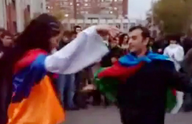 На YouTube выставлено видео, где молодой парень, надев на плечи азербайджанский флаг весело танцует лезгинку с девушкой, у которой на плечах армянский флаг. Ни стыда, ни совести, ни чести нет у этого азербайджанца! Или он забыл, что до сих пор 20% азербайджанских земель находятся под пятой армянских оккупантов, или он забыл о зверствах армянских фашистов в Карабахе, что он променял свою честь и совесть на танец с армянкой. И почему никто среди окружающих его, если среди них были азербайджанцы, не остановил эту лезгинку?