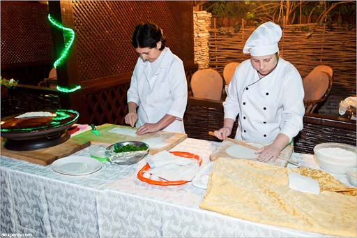 Гостям были предложены различные блюда и сладости азербайджанской кухни, во дворе ресторана на глазах у гостей пекли на садже лаваш, кутабы, готовили на мангале шашлык. Плов был подан в сопровождении огня. Украшением стола были пахлава, шекербура и чай с кекоту.