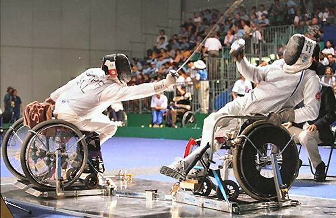 Современная история реабилитации фехтованием начинается с 1952 года, когда данный вид спорта стал доступным и для людей, прикованных к инвалидным креслам. С 1960 года фехтование было включено в программу Паралимпийских игр, где разыгрывается 15 комплектов олимпийских наград. С этого времени среди паралимпийцев регулярно проводятся чемпионаты мира и Европы, а также Кубки мира. В соревнованиях по паралимпийскому фехтованию (или, как его называют по-английски, wheelchair fencing, а по-французски, escrime handisport) принимают участие атлеты с поврежденным спинным мозгом, ампутированными конечностями и другими травмами. Спортсмены фехтуют на электрооборудовании, сидя в закрепленных колясках, на дистанции вытянутой руки с оружием (рапирой, саблей, шпагой). Все остальные правила судейства не отличаются от обычного фехтования.