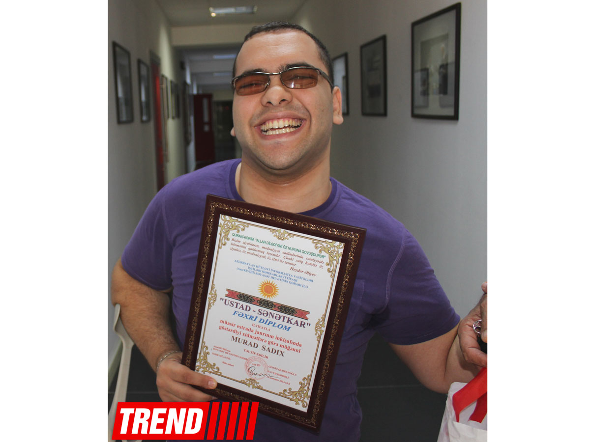 БАКУ /Trend Life/ - Молодой талантливый певец Мурад Садых удостоен почетным дипломом "Ustad-Sənətkar"("За исполнительское мастерство") от Совета правления профсоюза работников СМИ Азербайджана, сообщил Trend Life исполнитель. Диплом вручен за заслуги в развитии современного эстрадного искусства.