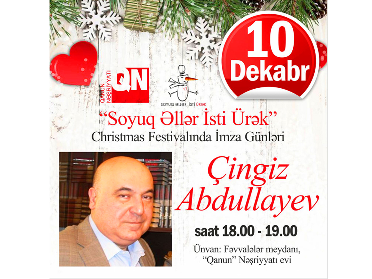 В рамках проекта в домике Издательства "Qanun" бакинцы и гости столицы смогут встретиться и пообщаться с известными азербайджанскими писателями Чингизом Абдуллаевым (10 декабря, с 18.00 до 19.00), Рашадом Меджидом (16 декабря, с 14.00 до 15.00) и Анаром (17 декабря, с 14.00 до 15.00), которые также проведут автограф-сессии.