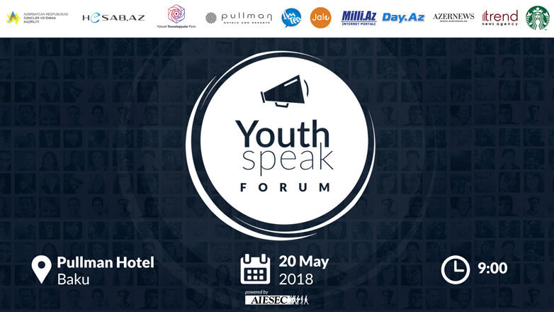 YouthSpeak Forum - это ежегодное мероприятие, направленное на привлечении молодых людей, интересующихся саморазвитием. Форум основывается на Целях устойчивого развития (SDG) ООН, проведении семинаров и сессий высококвалифицированными представителями ведущих компаний корпоративного сектора Азербайджана. Это место для расширения своего окружения путем общения со спикерами и другими делегатами; получения от них ценных советов; личностного и профессионального развития; получения знаний о соответствующих социальных проблемах; а также принятия участия в захватывающей атмосфере организации AIESEC! В этом году спикерами Форума выступят представитель ПРООН в Азербайджане Гулам Исакзаи, председатель Государственного комитета по делам семьи, женщин и детей Азербайджана Хиджран Гусейнова, глава отдела кадров EY Azerbaijan Самира Шабанова, генеральный директор High Tech Park Турал Керимли, генеральный директор инкубационного центра Youth Inc. Алекпер Мустафаев и другие известные личности.
