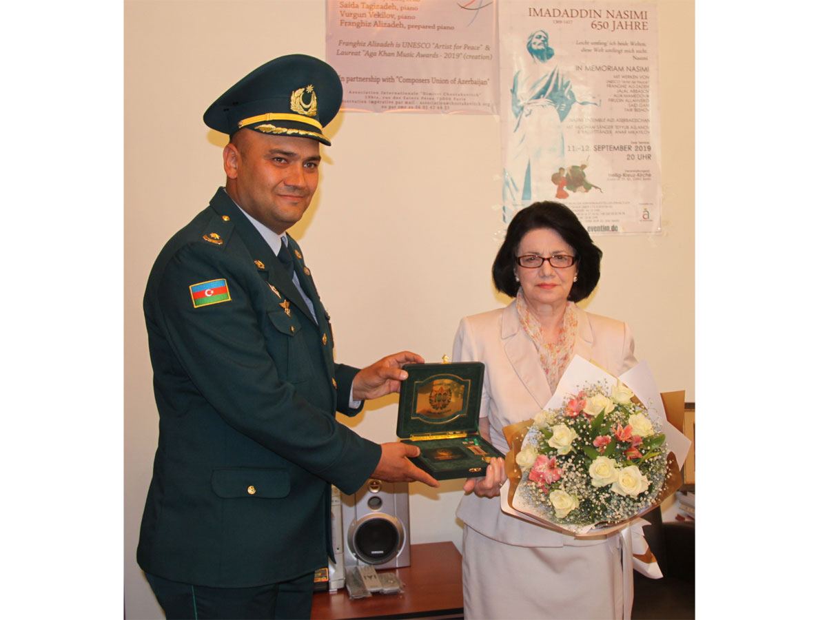 Памятная медаль была вручена Фирангиз Ализаде художественным руководителем и дирижером Образцового военного оркестра Государственной пограничной службы Азербайджана Самедом Векиловым, особо отметившим тесное сотрудничество между руководимым им коллективом и Союзом композиторов.
