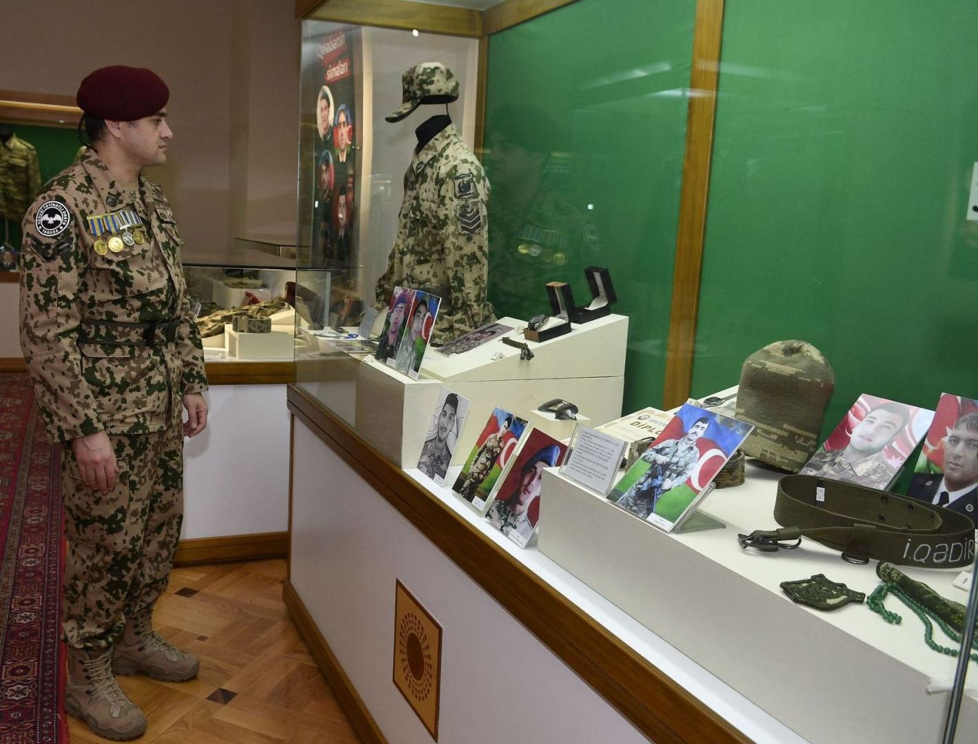 На выставке представлены военная форма, личные документы, фотографии 104 шехидов и 10 ветеранов 44-дневной Отечественной войны. В каждом разделе экспозиции размещены соответствующие информационные табло.