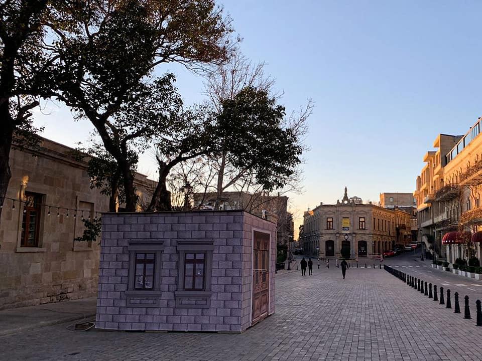 Макет дома, декорированного в стиле 90-х, размещен у входа в старинную часть Баку – Ичери шехер, около "Qoşa Qala qapısı" (Парные ворота).