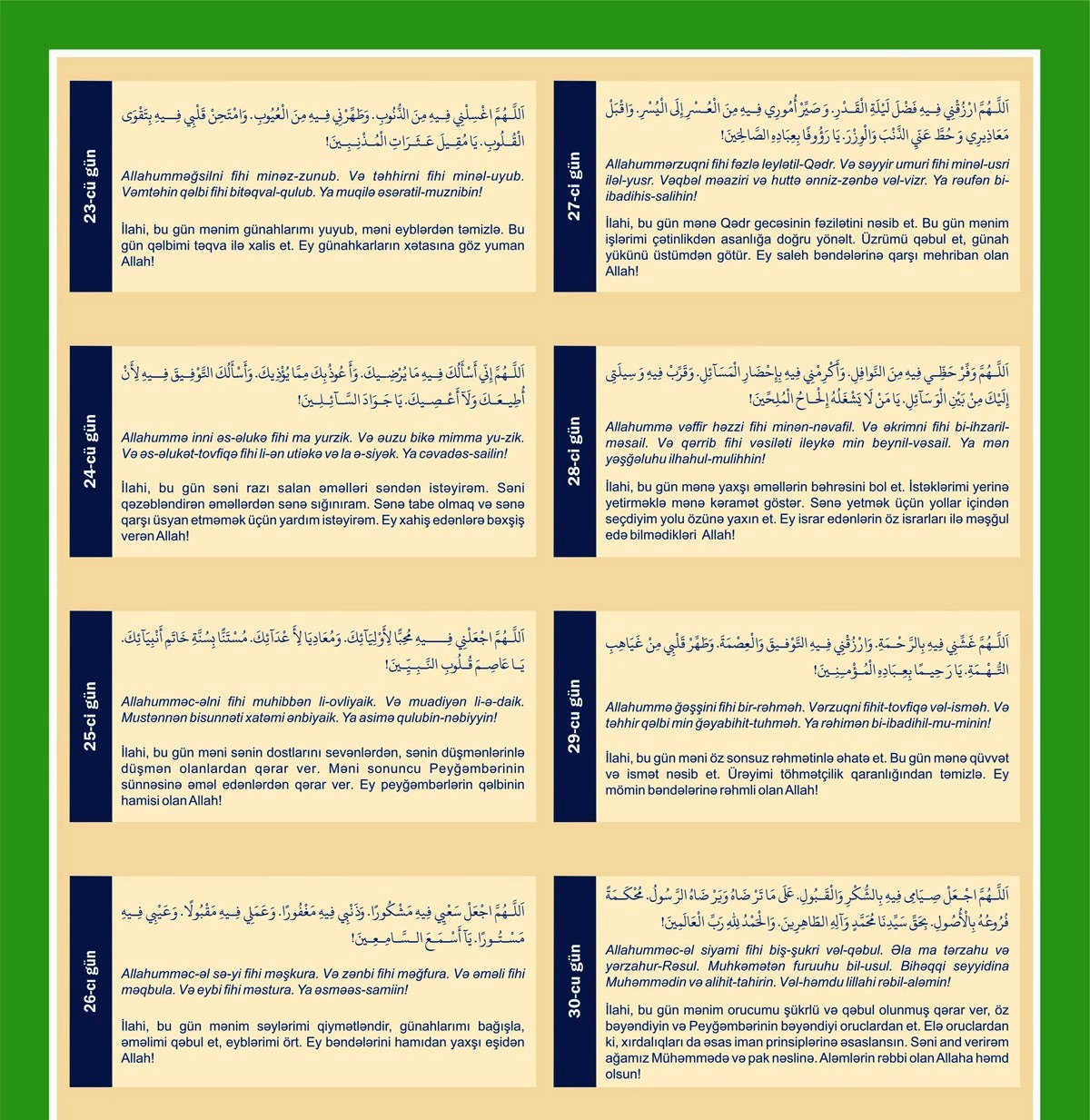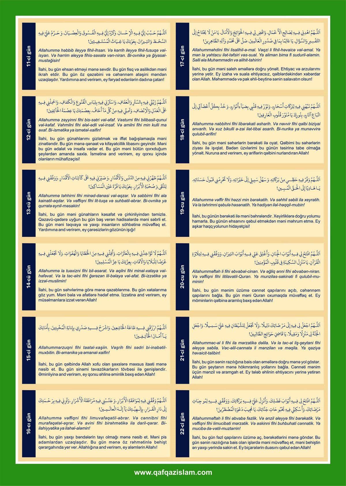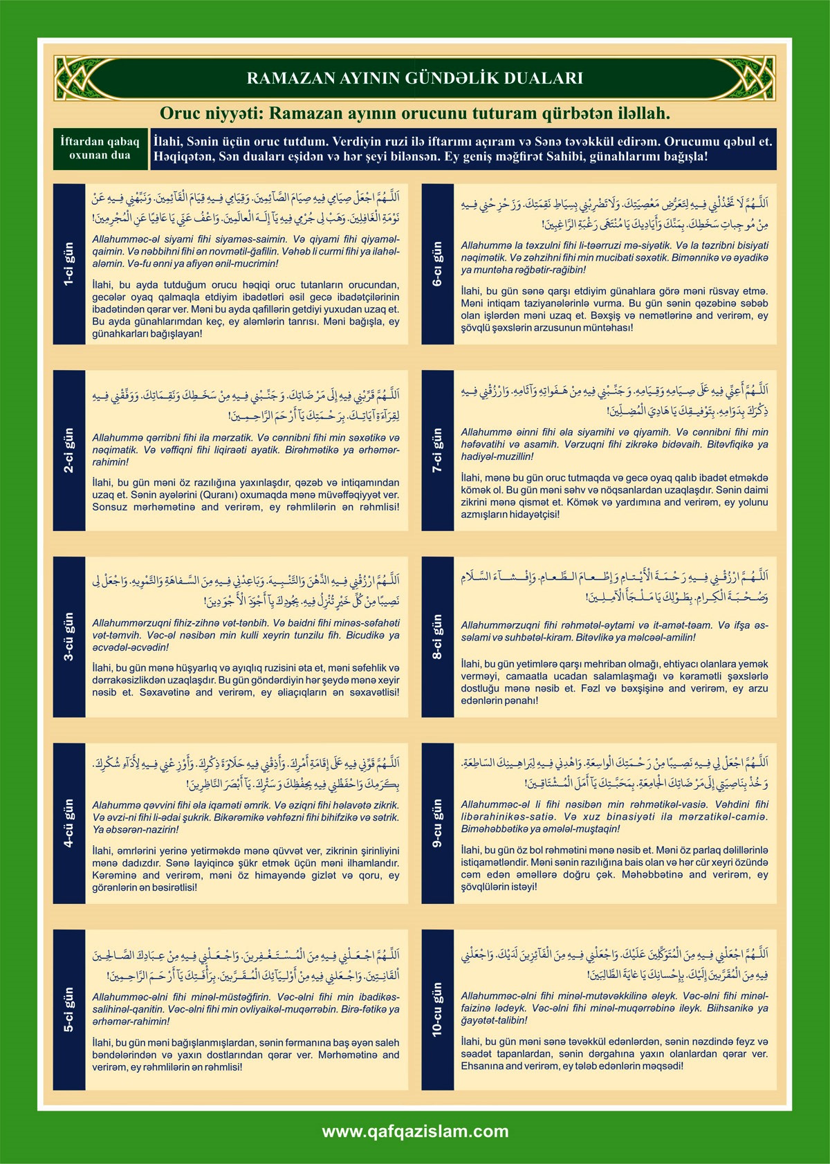 Каждый день, после утреннего принятия пищи (имсак), перед тем, как начать пост необходимо произнести молитву (ниййет), также как и во время разговения (ифтара). О молитвах можно узнать из специальной религиозной литературы.
