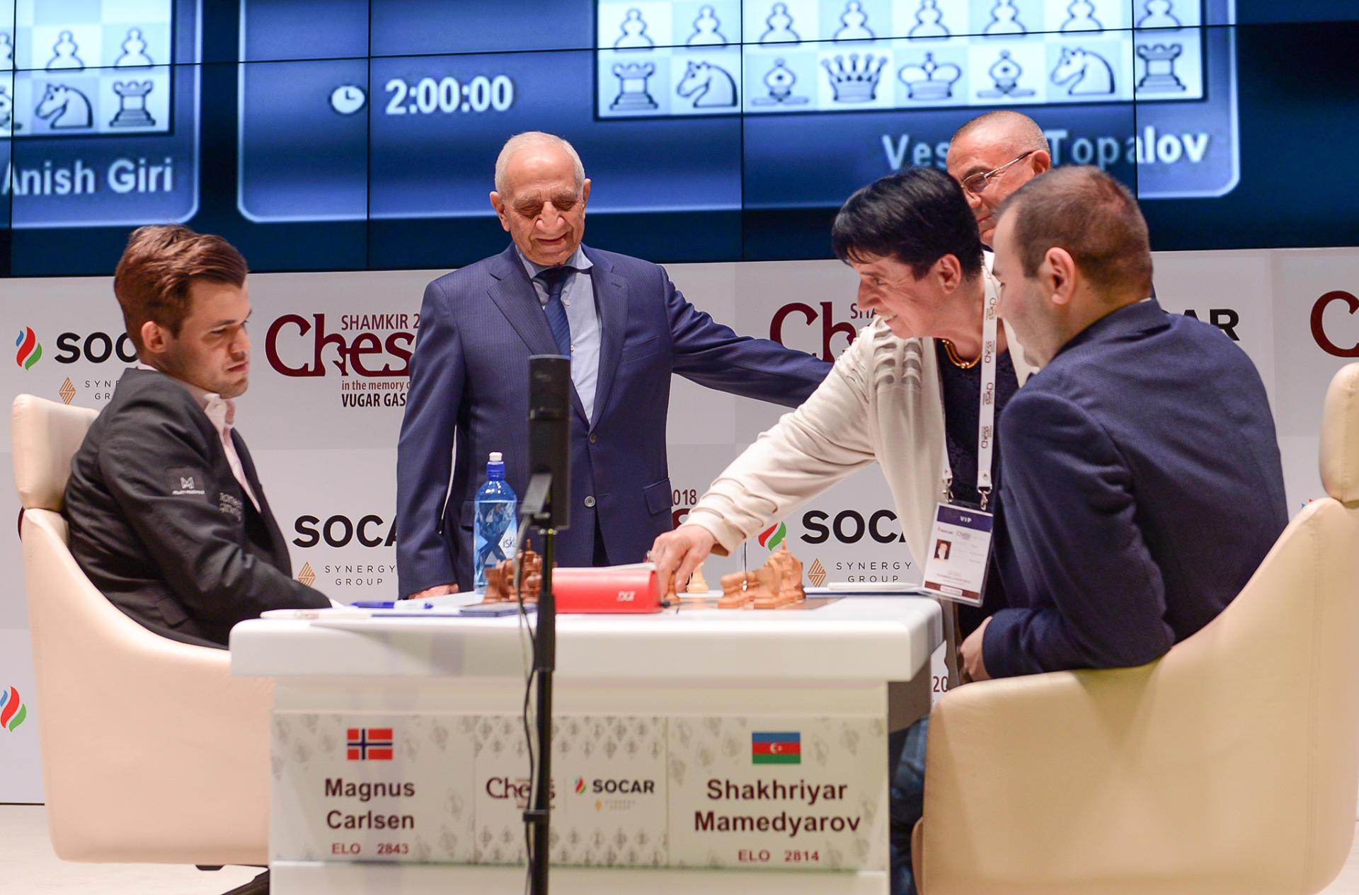 В первом туре центральной стала партия между двумя сильнейшими шахматистами планеты - чемпионом мира Магнусом Карлсеном и Шахрияром Мамедъяровым, идущим вторым в рейтинге ФИДЕ. Символический ход сделали многократная чемпионка мира Нона Гаприндашвили и глава Исполнительной власти Шамкирского района Алимпаша Мамедов. Соперники не выявили победителя, заключив мир на 50-м ходу.